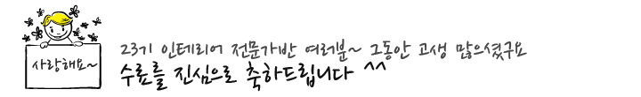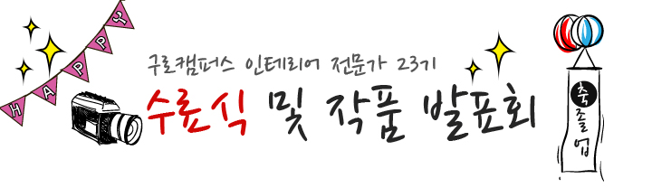 구로 캠퍼스 [수료식] 인테리어전문가 23기 작품발표회 및 수료식 Post. 2012.03.28 1. 개회식 2. 포트롤리오 발표회 3. 취업지원 및 사후관리 안내특강 4. 수료식 및 수료증 전달 5. 기념촬영 6. 다과회